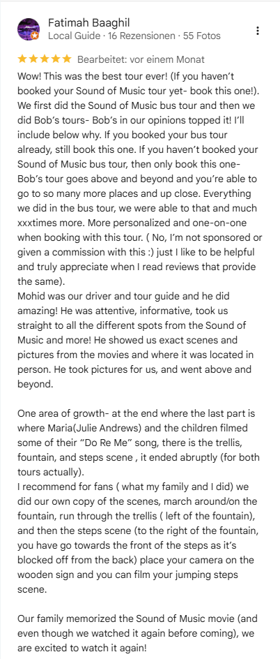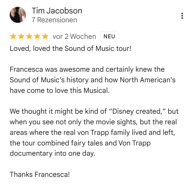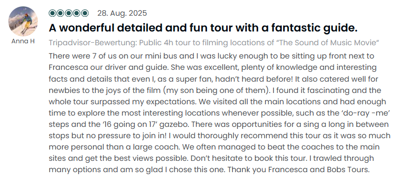 Was diese Tour zu den Drehorten der „Sound of Music“-Filme so besonders macht, ist die intime Atmosphäre in kleinen Gruppen, die ein persönlicheres und detaillierteres Erlebnis ermöglicht. Was diese Tour zu den Drehorten des „Sound of Music“-Films so besonders macht, ist die intime Atmosphäre in kleinen Gruppen, die ein persönlicheres und detaillierteres Erlebnis ermöglicht.