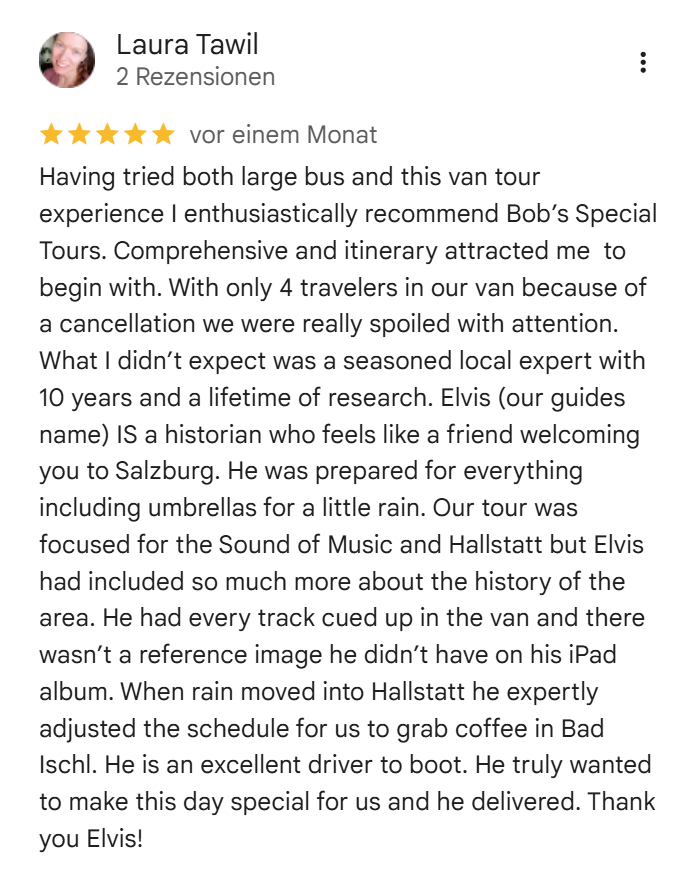 Bob’s Special Tours wurde 1976 als familiengeführtes Unternehmen gegründet und 2024 an ein junges, engagiertes Team staatlich geprüfter Austria Guides übergeben. Seit jeher verfolgen wir ein Ziel: persönliche, maßgeschneiderte Reiseerlebnisse abseits des Massentourismus. Unsere Wurzeln liegen tief in Salzburg; unsere Guides sind erfahrene Profis, die diese Stadt und ihre Umgebung seit vielen Jahren ihr Zuhause nennen.