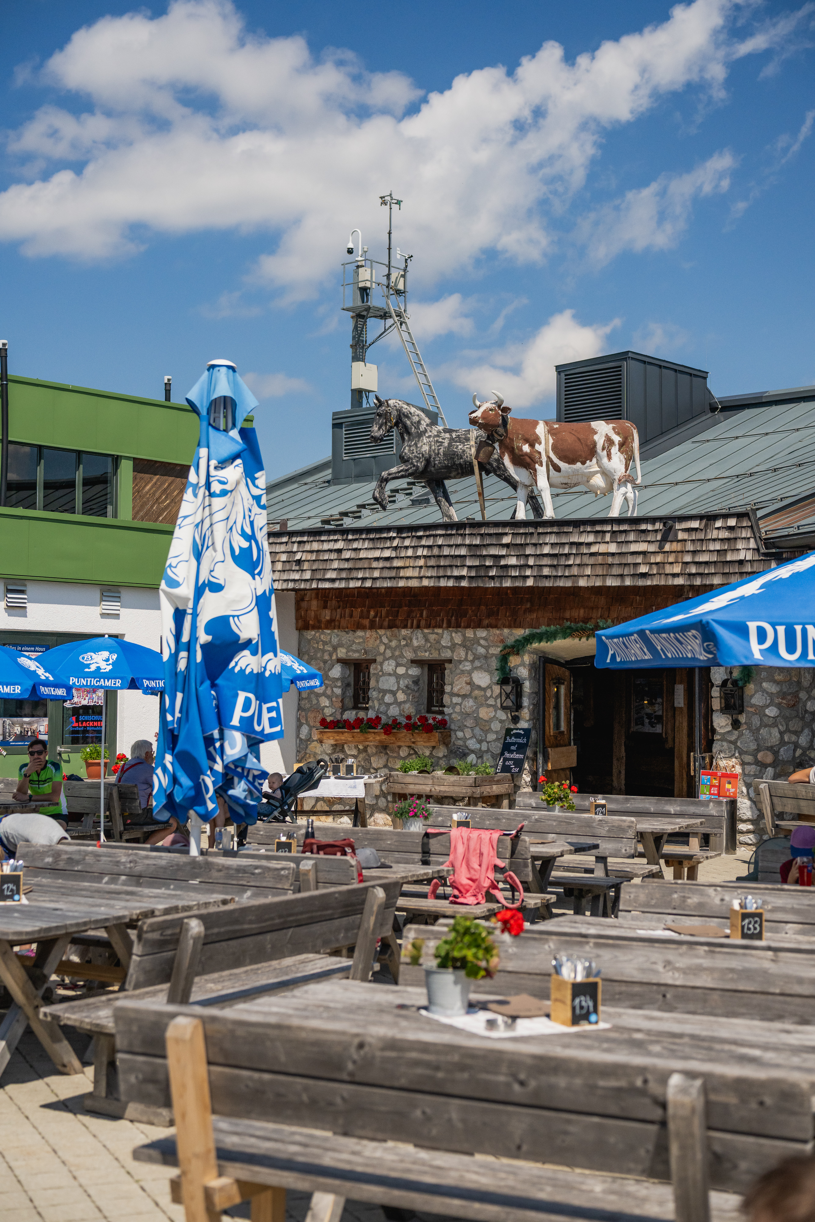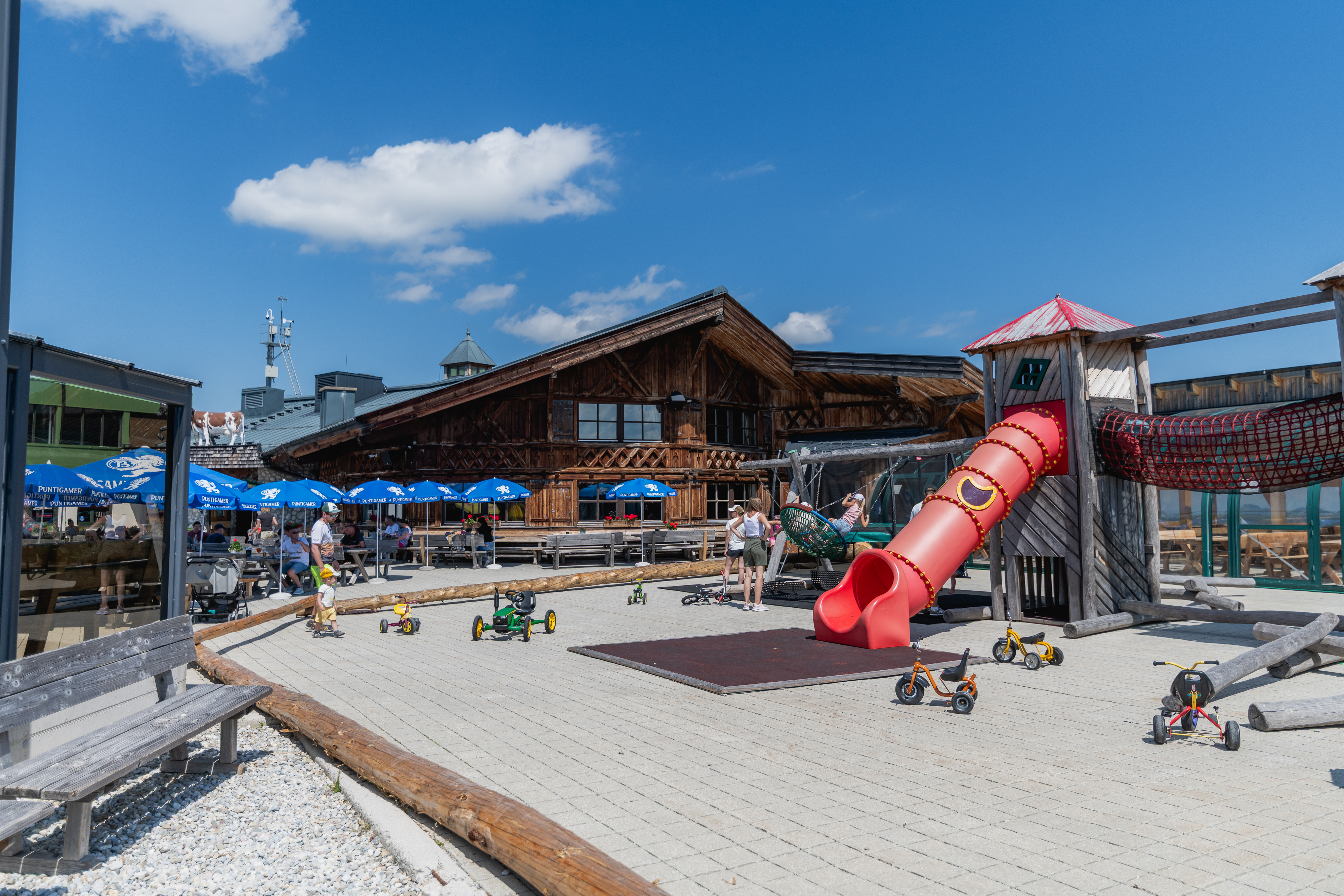 Die Laireiteralm liegt auf 1.850 m Seehöhe direkt an der Bergstation der Panoramabahn Großarltal und ist zu jeder Jahreszeit ein beliebter Treffpunkt für Genussmenschen und Bergliebhaber. Als großzügige Selbstbedienungshütte bietet sie innen Platz für rund 300–350 Gäste, dazu kommt eine weitläufige Sonnenterrasse, auf der bei Schönwetter bis zu 500 Personen das Panorama der Salzburger Bergwelt genießen können. Ob Skifahrer im Winter oder Wanderer und Familien im Sommer – hier erwarten Sie regionale Schmankerl, gemütliche Nischen und echte Hüttenatmosphäre.