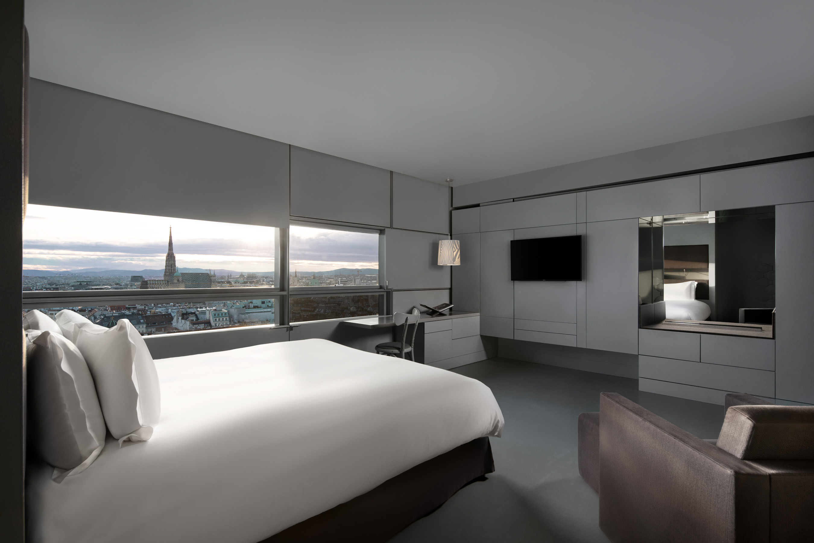 SO/ Vienna ist ein Designhotel für eine internationale Community aus Mode-, Kunst- und Architekturinteressierten. Entworfen von Jean Nouvel eröffnen alle 182 Zimmer und Suiten den Blick über Wien. Klare Ästhetik trifft auf urbane Lage am Donaukanal. Das 360-Grad-Rooftop mit Restaurant und Bar zählt zu den prägendsten Treffpunkten der Stadt.